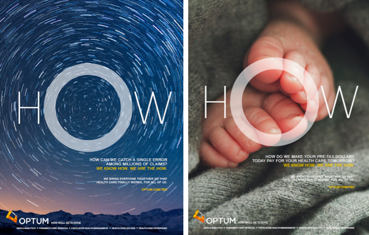 This, the OPTUM HEALTH CARE pitch. Not easy. Lots of very good agencies pitching. The client ask itself was a bit perplexing: “Use the brand tagline HOW WELL GETS DONE from the previous agency and make sense of it.” How do we make sense of a line that didn't make much sense? How can we do health care without sounding like the usual health care? We knew how, mercifully enough.
